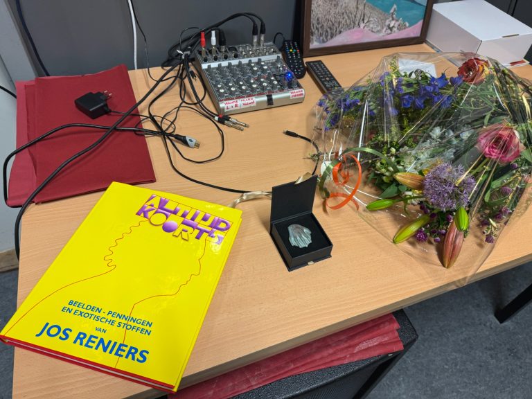 Paul van Zuylen wordt de penning overhandigd, een kunstwerk van Jos Reniers. Naast een boekt bloemen krijgt de feesteling ook een fraai naslagwerk met als titel ‘Altijd Koorts’. Hierin zijn opgenomen de beelden, penningen en exotische stoffen van Reniers.